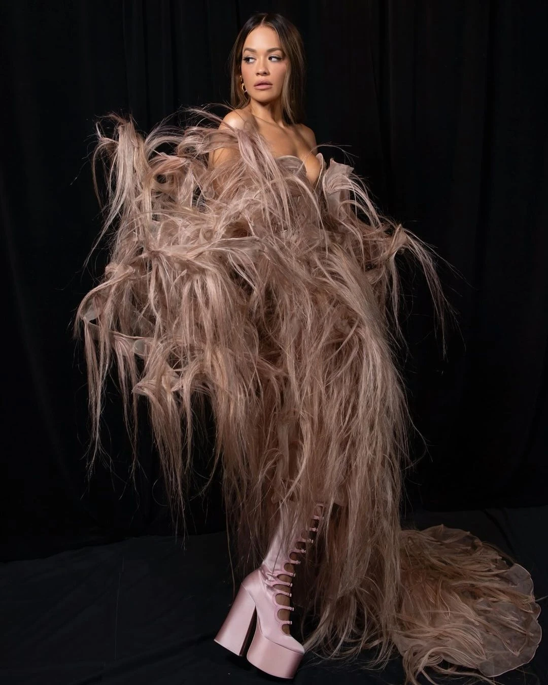 Así fue que vimos a la cantante británica Rita Ora por su paso por la alfombra roja de los MTV EMA 2024 con un diseño emplumado color nude de cuerpo encorsetado, que complementó con uno zapatos con plataformas XXL.