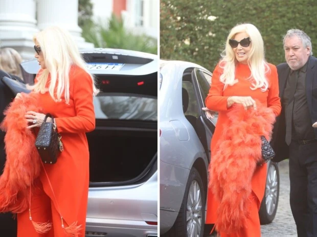Para la ocasión, la famosa eligió un impactante conjunto en color naranja intenso, compuesto por un elegante mono o pantalón sastre de corte amplio y líneas sofisticadas. El detalle estrella fue una estola de plumas al tono, que aportó dramatismo y movimiento a su look, reafirmando su sello de diva.