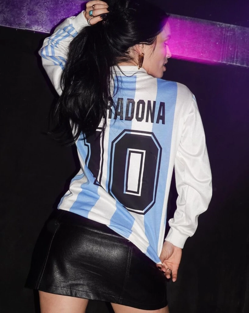 Según pudo saber la revista Gente, Pedro Rosemblat le regaló a su novia una camiseta titular de manga larga de la selección argentina del Mundial de 1994, con el dorsal 10 de Maradona, de la tienda especializada Casaqueando. Además, la cantante sumó sensualidad a su look con una minifalda de cuero negro ajustada al cuerpo.
