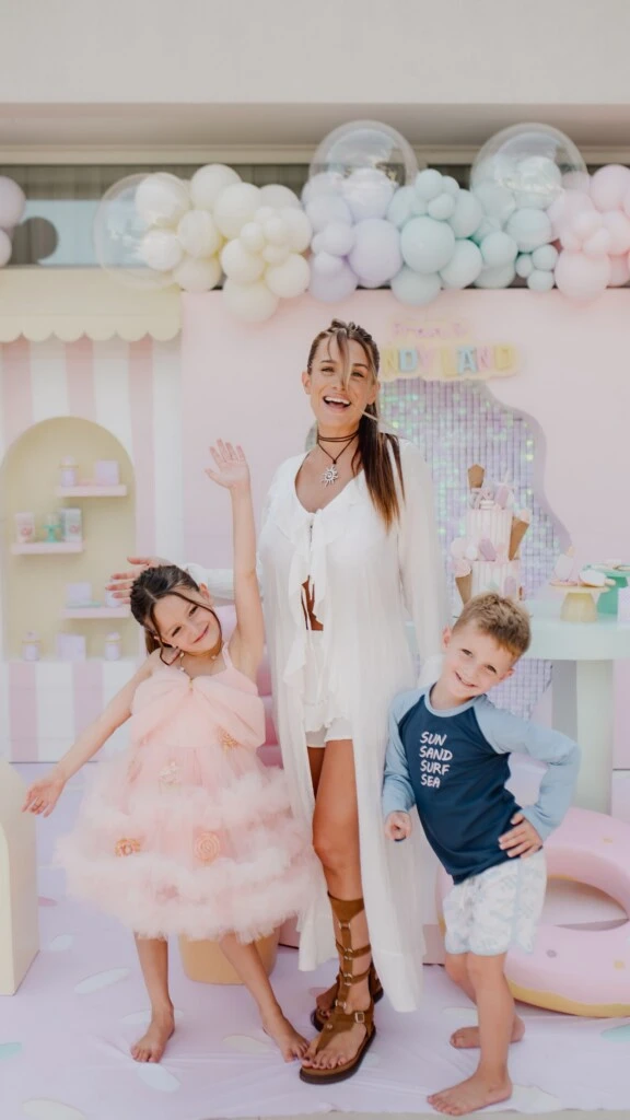 La elección del vestido no fue casual. La temática del cumpleaños fue “Candy Land”, un concepto que transformó el jardín en un universo pastel poblado de dulces gigantes, globos en tonos suaves, inflables multicolores y una estética que parecía salida de un cuento ilustrado.