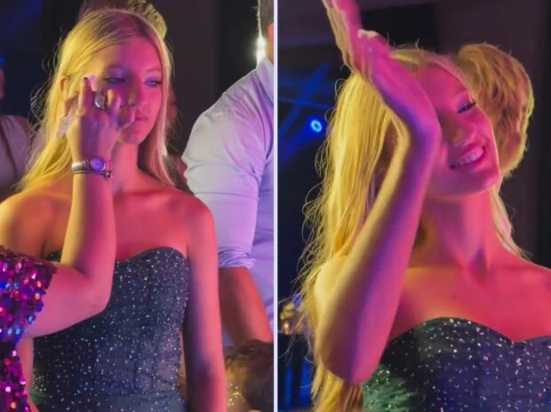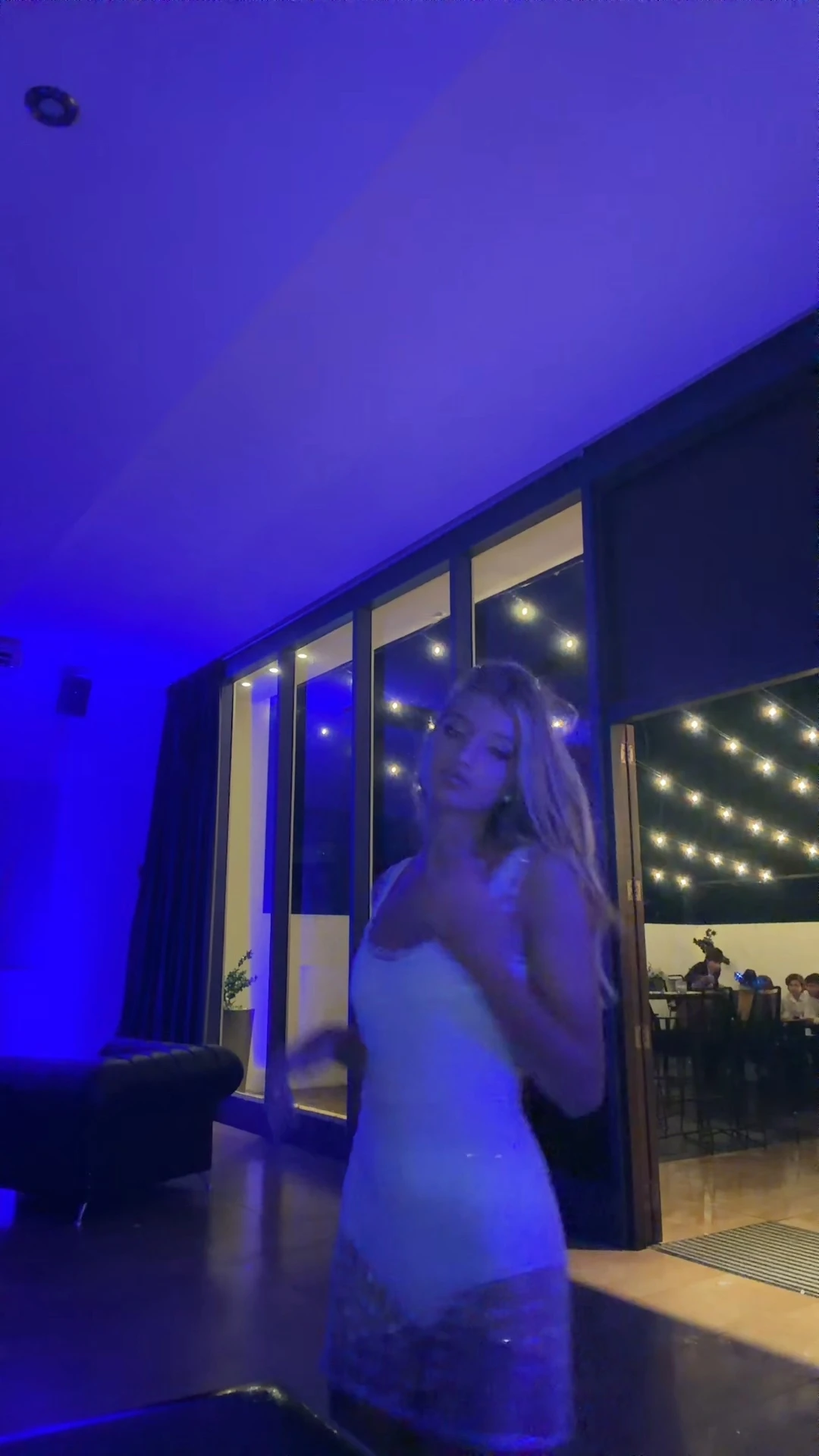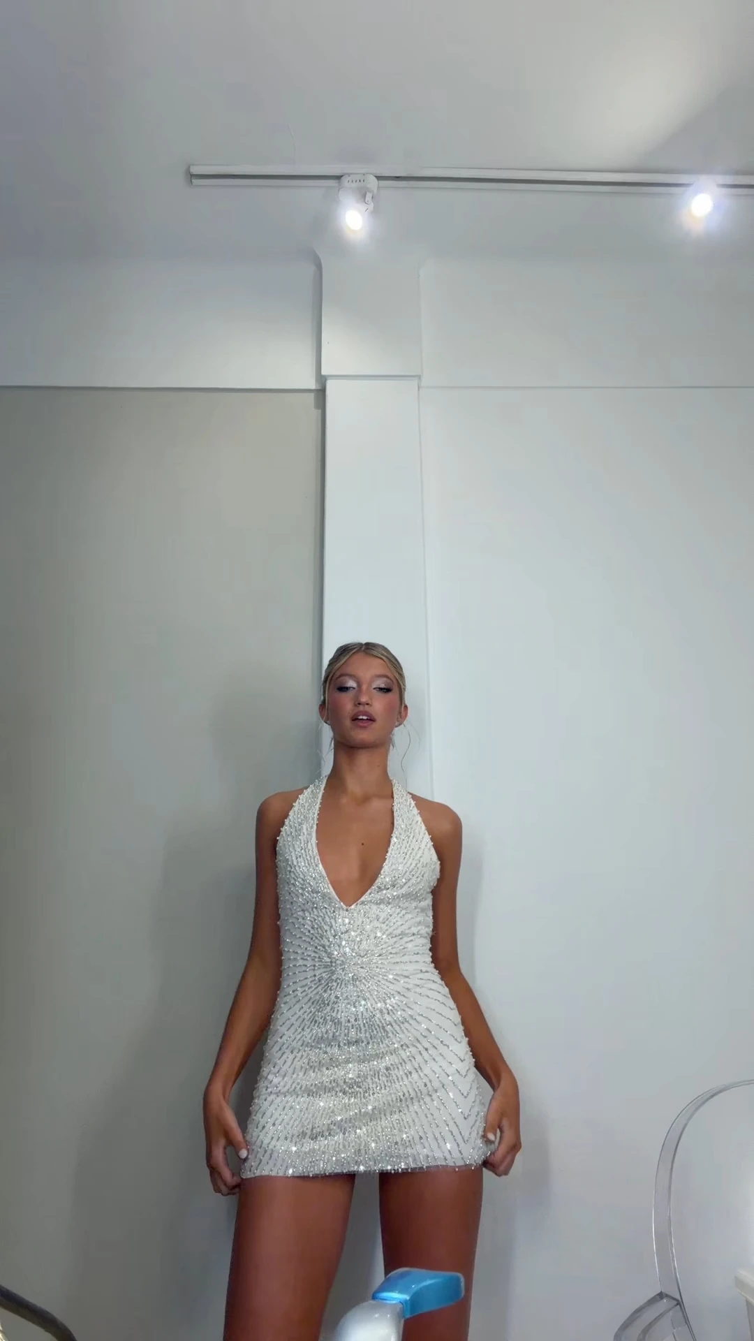 Acá también aparece un detalle clave de styling que se repite en coberturas: el pelo más recogido/pulido para ganar comodidad y despejar el escote, lo que vuelve al mini más “look completo” y menos “cambio de emergencia”. Es, además, el cambio que mejor dialoga con la estética “club” del salón: blanco + destellos es una fórmula infalible para que las luces reboten y el vestido se vea protagonista en video, incluso en planos lejanos.