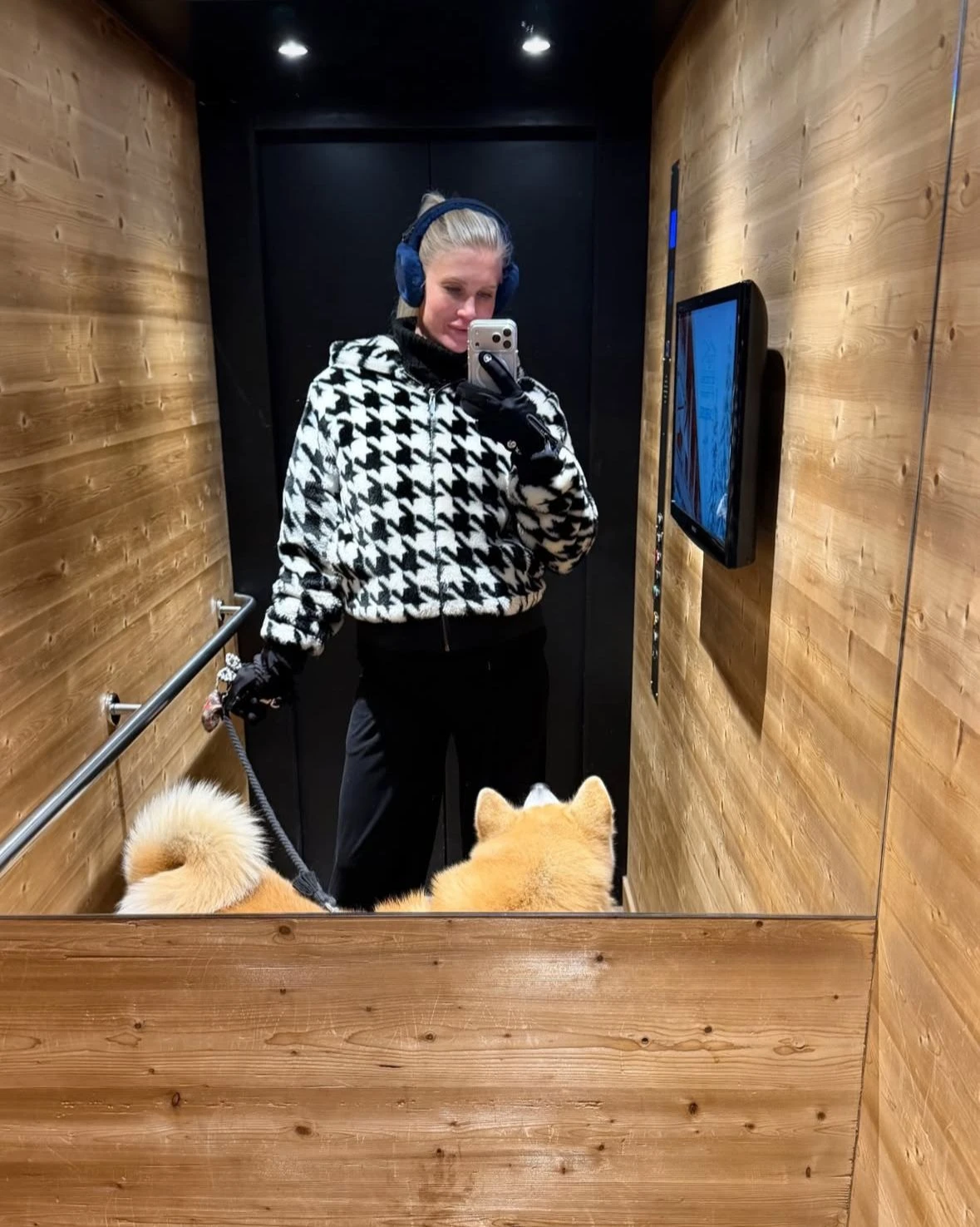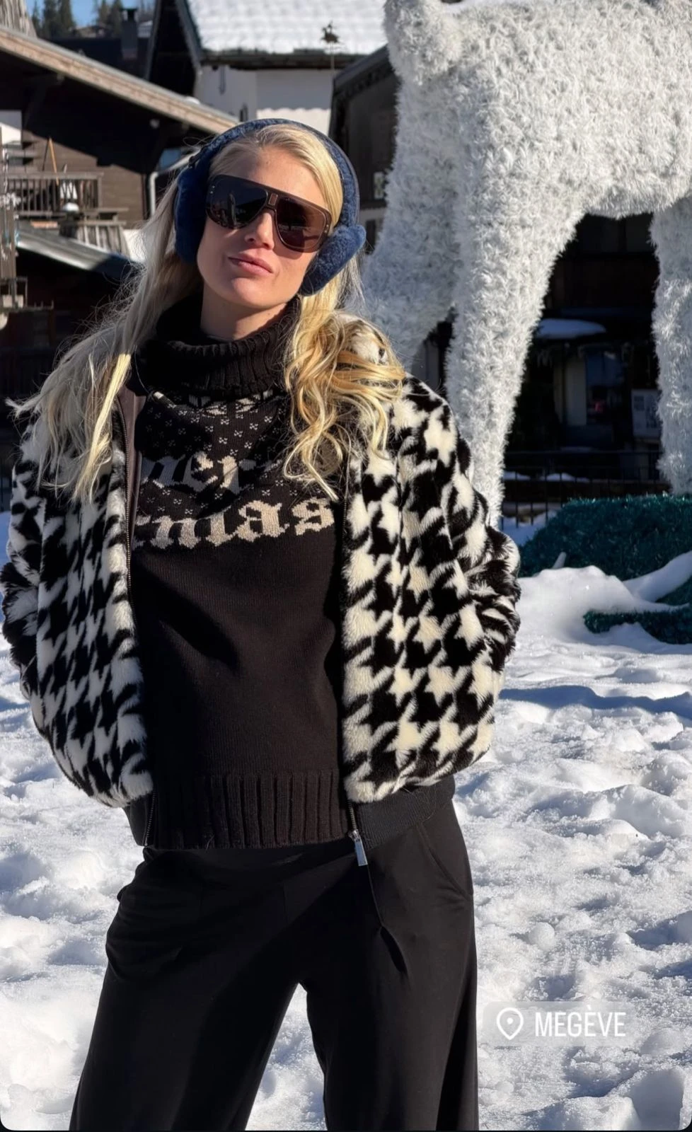 En las imágenes compartidas desde un ascensor revestido en madera y desde un radiante paisaje nevado en Megève, puede verse el look invernal que la modelo habría elegido para la ocasión. La pieza central es una chaqueta corta de pelo sintético con estampado pata de gallo, un clásico reinventado que aporta textura, volumen y un aire retro-chic. Debajo, lleva un suéter de cuello alto negro, de tejido grueso y detalles en beige, pensado para abrigar sin perder sofisticación.