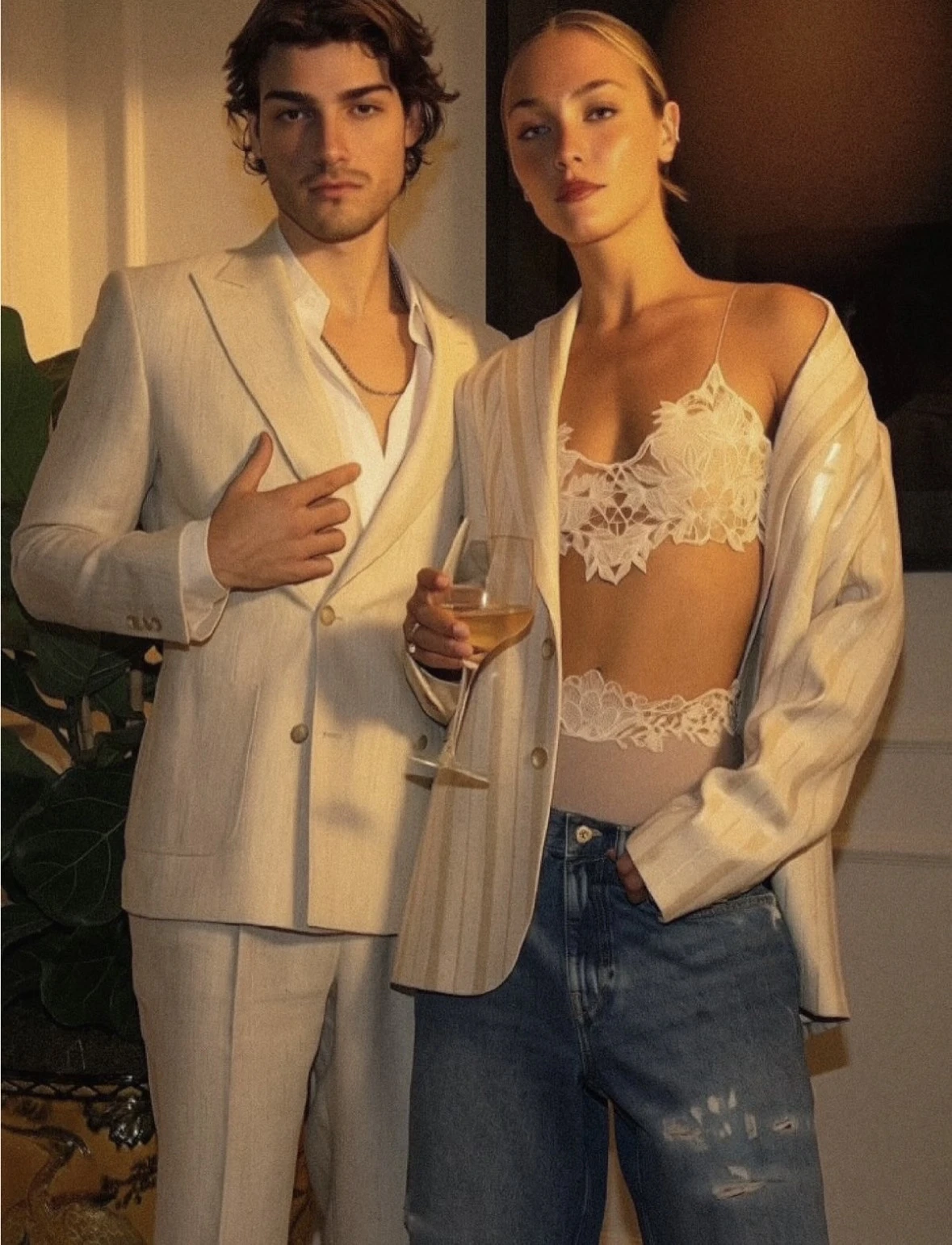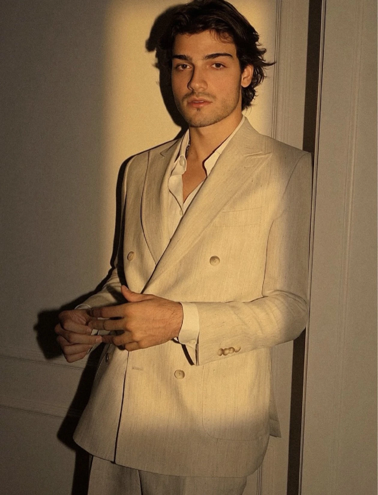 La iluminación cálida y lateral de las fotos refuerza esa atmósfera: piel dorada, sombras suaves, fondo neutro. Nada distrae del encanto del protagonista. El propio diseñador señaló que el joven "no solo viste la colección, la eleva y la convierte en elegancia".