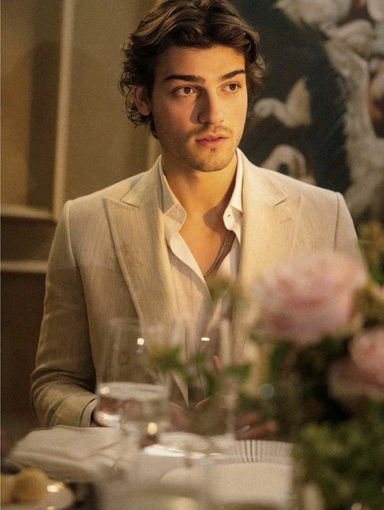 La elección de una camisa abierta y una cadena sutil en el pecho terminó de construir un outfit sofisticado pero sin rigidez, muy alineado con el concepto de lujo silencioso que pisa fuerte en la moda masculina. Su look se movió entre la sastrería tradicional y una lectura más moderna, logrando un equilibrio impecable.