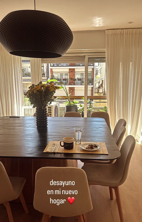 Más allá de los detalles de lujo, Muscari se encargó de demostrar que este piso ya tiene alma de hogar. Una de las fotos más comentadas fue la de su primer desayuno en una mesa de madera con flores amarillas y medialunas frescas. "Desayuno en mi nuevo hogar", posteó junto a una taza que lleva su nombre.