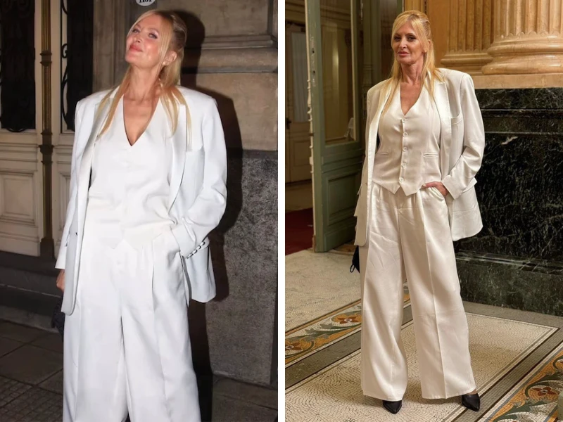 Entre sus últimas apariciones en público, cuando se rumoreaba que la actriz estaba saliendo con el Presidente de la Nación, Matilda Blanco destacó el look de su primera salida juntos al Teatro Colón: "Aplausos para ese tres piezas de chaleco, saco y pantalón oversize blanco".
