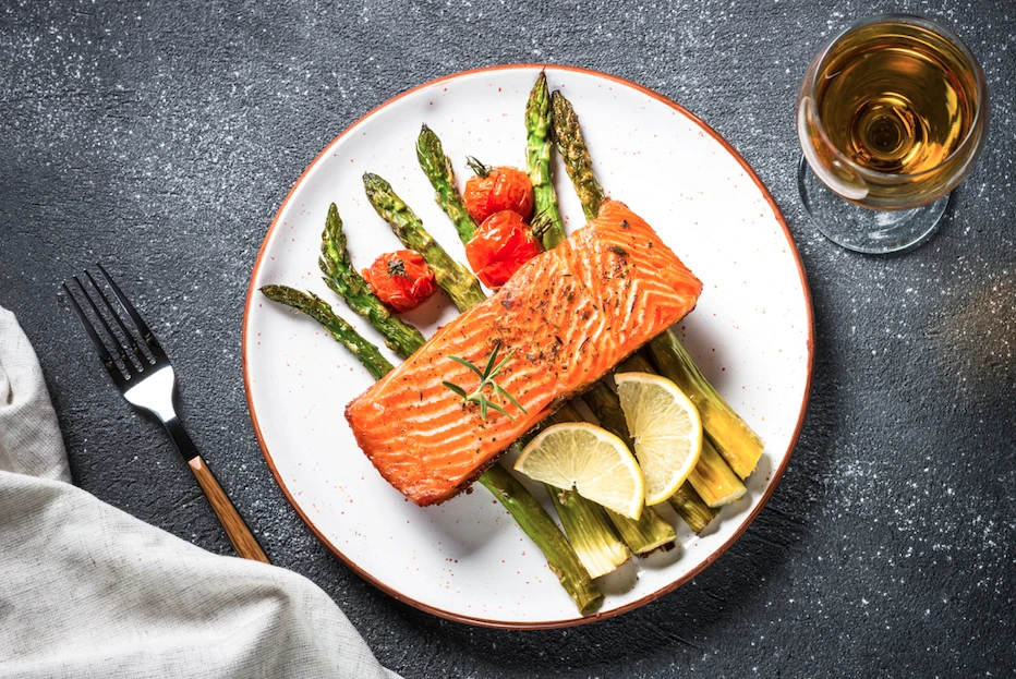 Preparación: Cocinar el salmón con los espárragos en el horno a 180°C durante 20 minutos. Aliñar con ajo y limón.