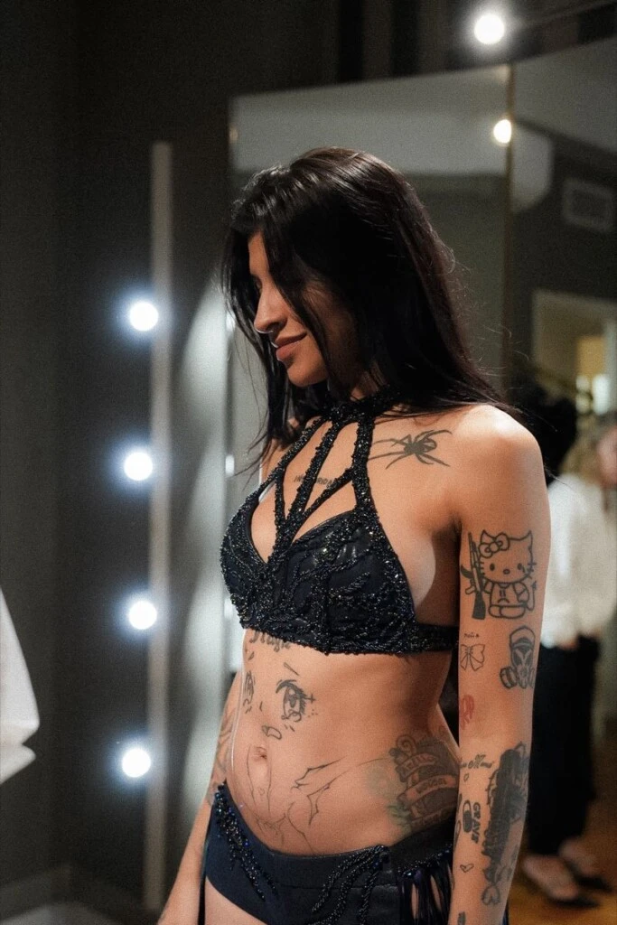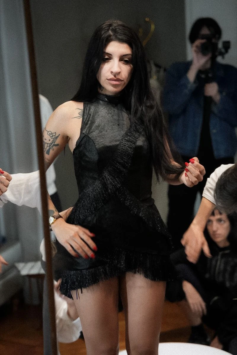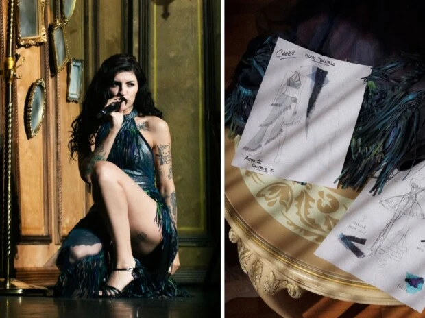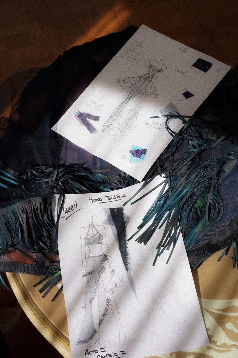 "Hay todo un mood completo que es negros, peltres y platas, con un guiño a los noventa en las transparencias y en esa parte seductora que Cazzu tiene", le relatan a GENTE las diseñadoras y detallan que para los vestidos de esta parte más bien melancólica del show trabajaron con "chifones negros, brillos bordados a mano, pedrerías en azabache y géneros que generan transparencias alucinantes".