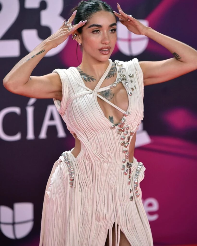 El estilismo de Nicki Nicole fue uno de los más elogiados de la noche. La artista que llegó acompañada con su novio, Peso Pluma, apareció con un vestido rojo fuego en la alfombra roja con un diseño totalmente ceñido al cuerpo que marcó perfectamente su silueta.