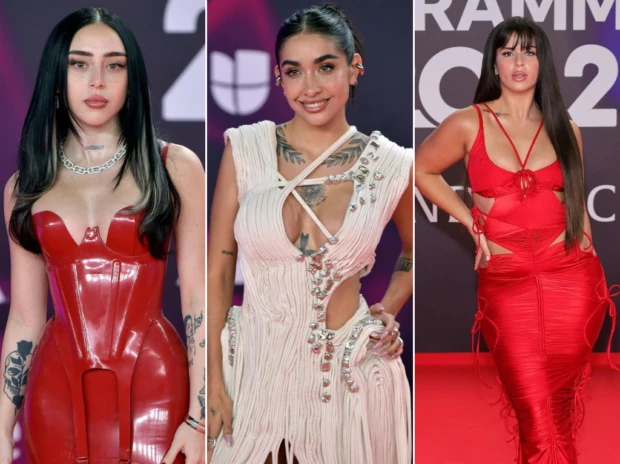 El estilismo de Nicki Nicole fue uno de los más elogiados de la noche. La artista que llegó acompañada con su novio, Peso Pluma, apareció con un vestido rojo fuego en la alfombra roja con un diseño totalmente ceñido al cuerpo que marcó perfectamente su silueta.
