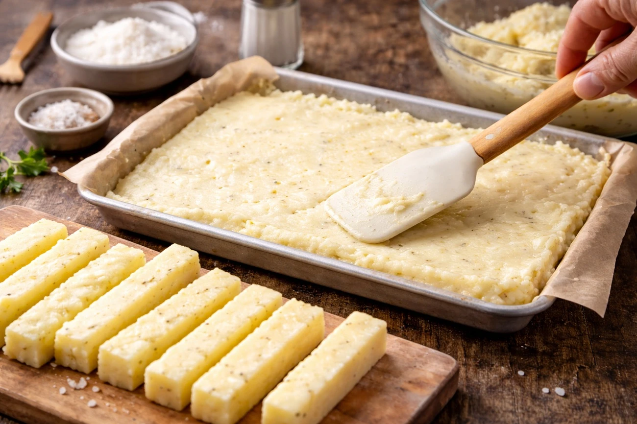 El secreto para que estas papas no se desarmen está en la cantidad de almidón y en el enfriado. La fécula le da estructura al puré y, al enfriarse, la masa se vuelve firme y fácil de cortar. Si la mezcla está blanda o tibia, los bastones no resisten la fritura.