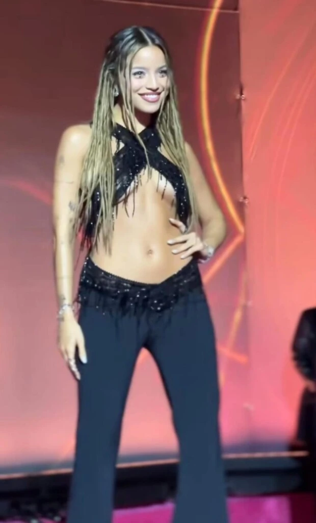 A esto le sumó, un pantalón a la cadera con bota ancha, y para darle un toque más de gala, le sumó flecos con brillos al conjunto, muy a tono con lo que viene mostrando en su estilismo inspirado en los 2000.