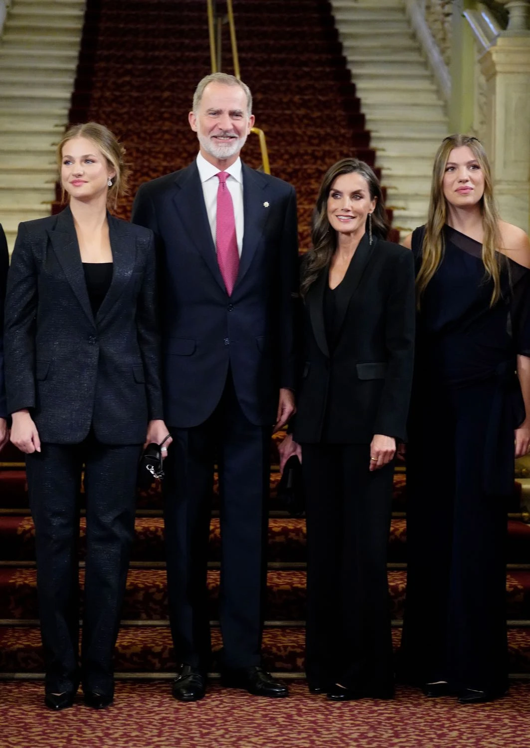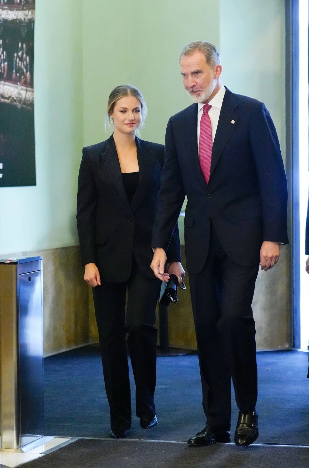La heredera al trono español optó por un traje sastre en azul noche, de silueta estructurada, que a simple vista podría confundirse con negro, aportando una dosis de rigor institucional al evento. Lo combinó con un top negro.
