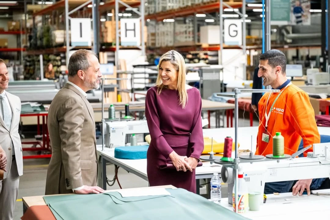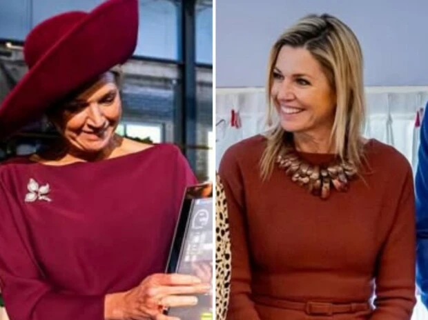 Uno de los ejes más claros en sus elecciones es la apuesta por la sastrería soft, una tendencia que redefine las estructuras clásicas con una caída más amable y femenina. En una de sus apariciones, Máxima optó por un vestido midi en tono borgoña, de líneas limpias y mangas largas, que se ajusta al cuerpo sin rigidez.