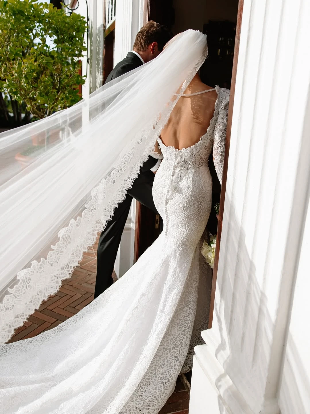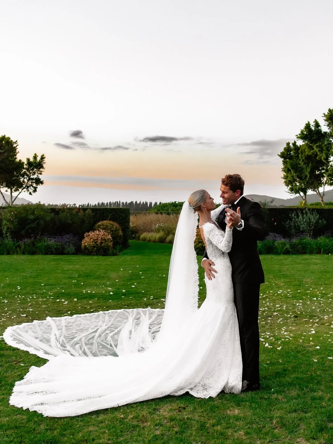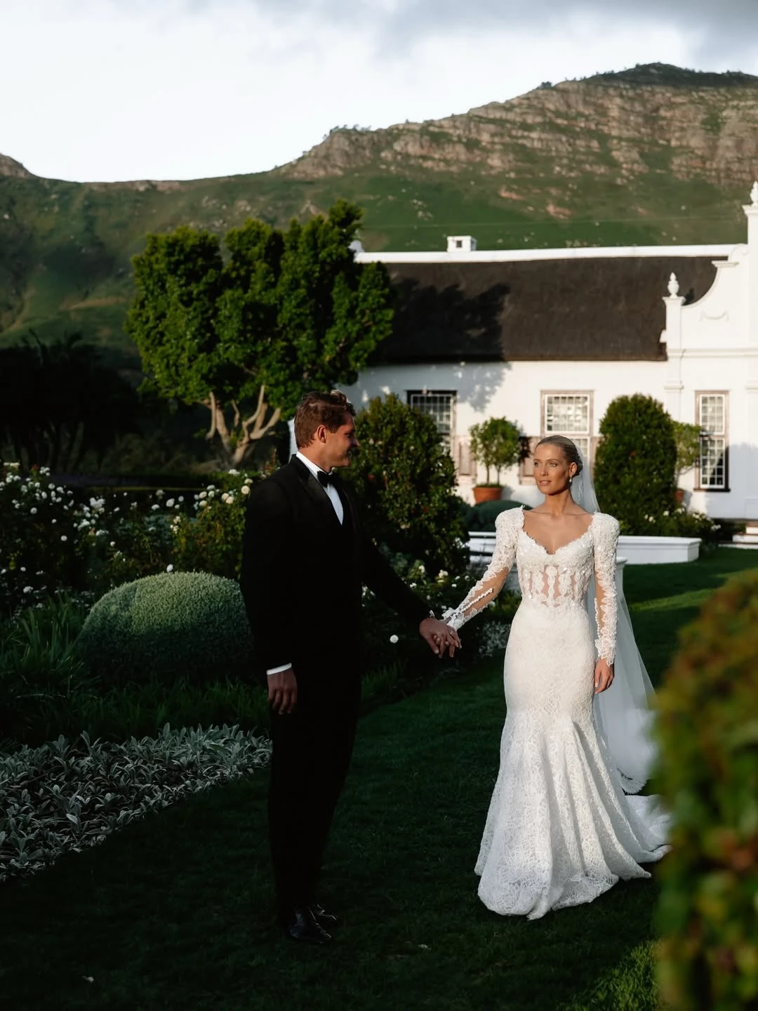 La ceremonia, realizada en Sudáfrica, en el Quoin Rock Wine Estate, entre montañas y viñedos, fue el escenario perfecto para un estilismo que conjugó romanticismo y precisión.