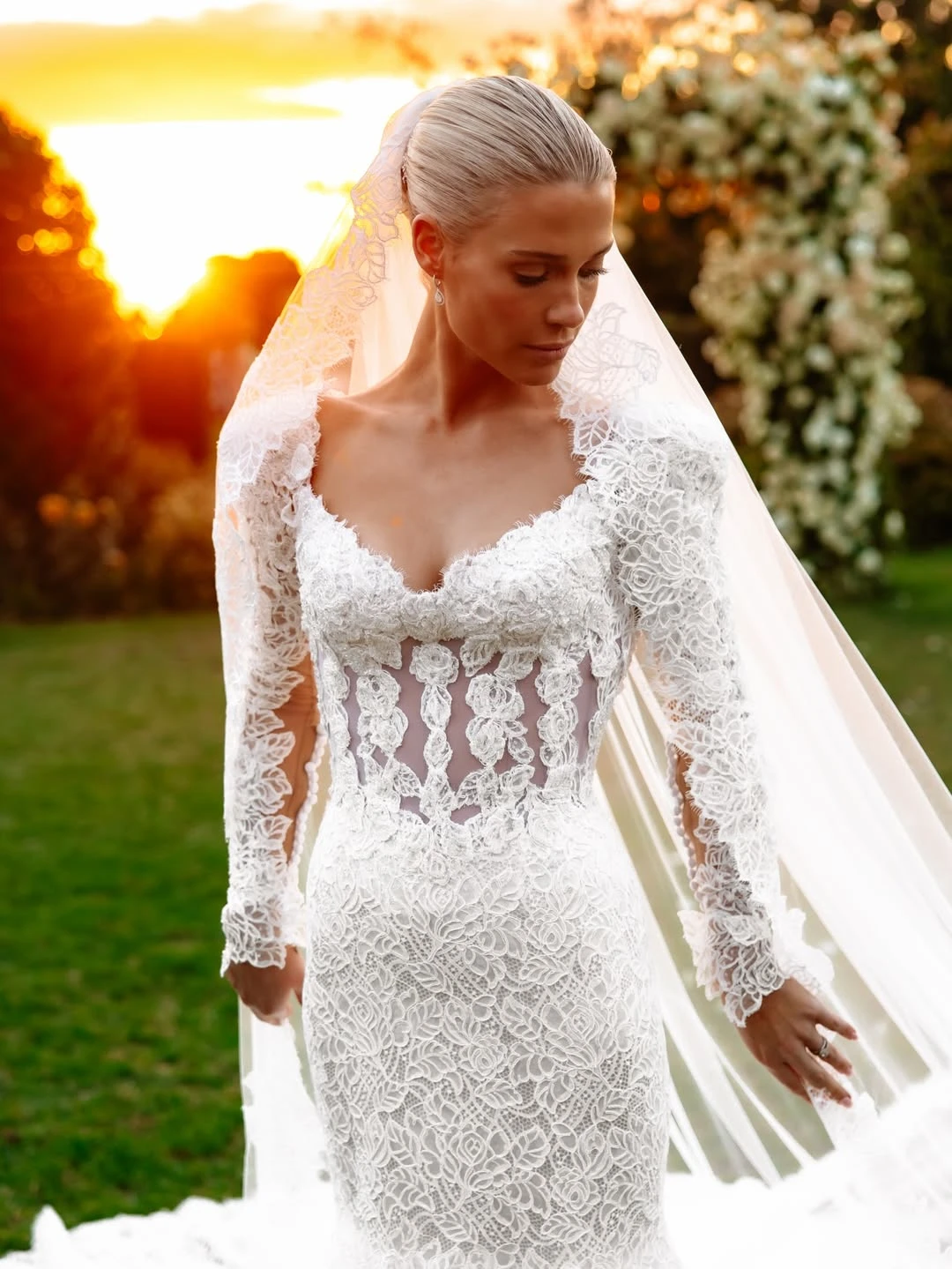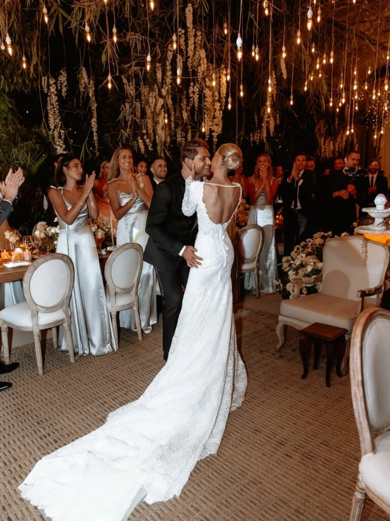 Pero fue su elección de un Versace a medida la que terminó de sellar una imagen que hoy funciona como referencia para novias que buscan elegancia en clave contemporánea, especialmente en contextos de entretiempo.