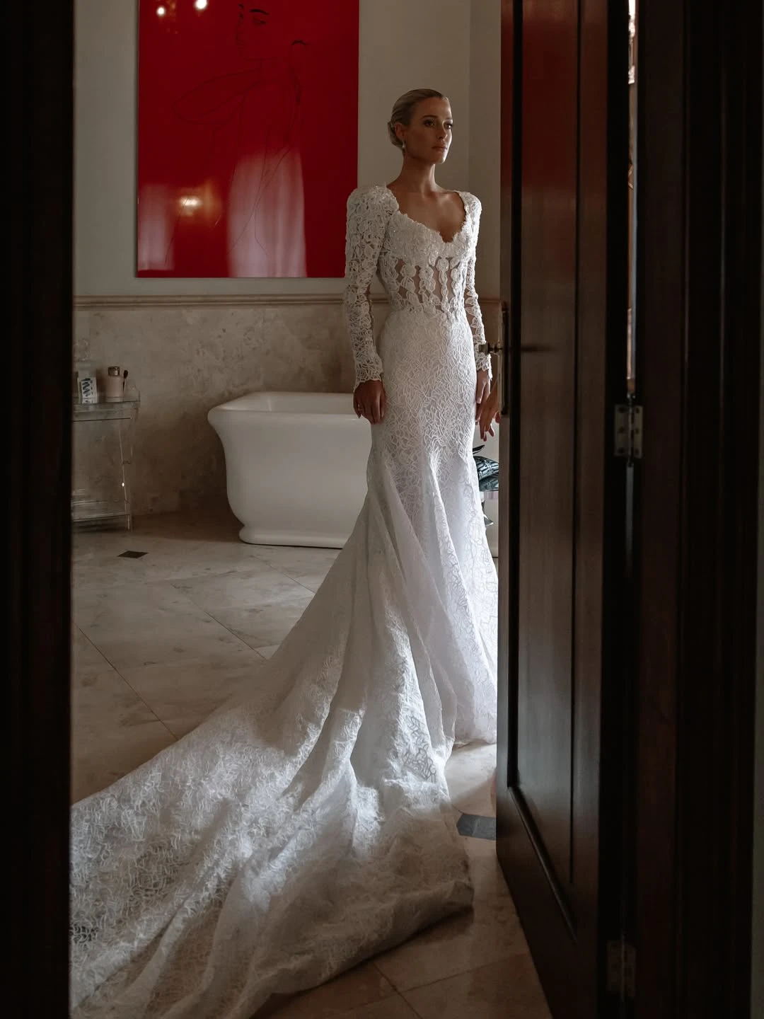 La silueta, ajustada hasta la rodilla, delineaba el cuerpo con una estructura impecable, mientras que las mangas largas —clave para bodas en estaciones intermedias— sumaban sofisticación y equilibrio térmico.
