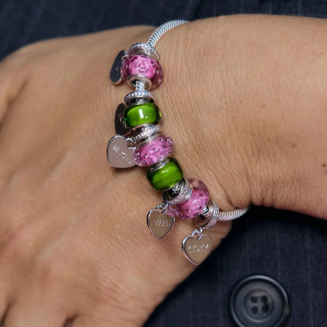 Cada diseño incluye tres cristales de murano rosados, dos charms verdes en plata con cristal de murano y cinco dijes colgantes de corazón en plata grabados con los nombres de sus hijos, creando una composición cromática vibrante en tonos rosa y verde que refuerza la idea de unión familiar.