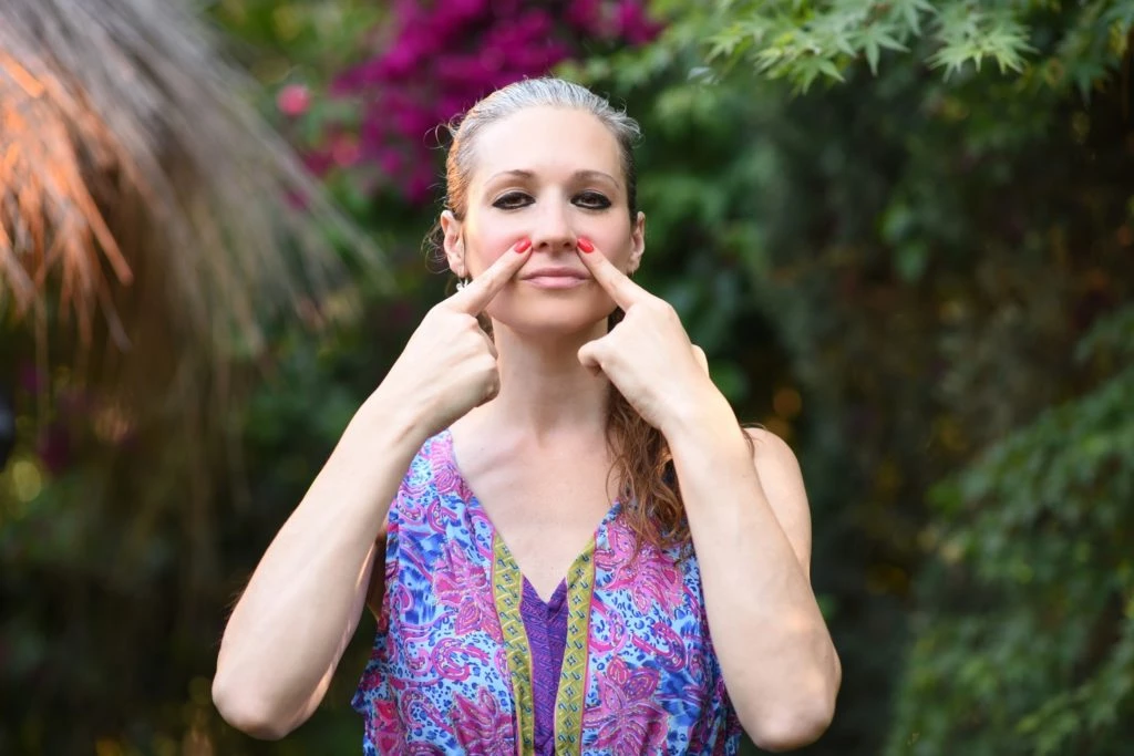 - Ojos de Gato: Es una postura muy potente que trabaja y libera tensiones en todo el rostro pero especialmente de los músculos temporales y de los músculos maseteros (músculos masticatorios). Ayuda también a prevenir y reducir dolores de cabeza y migrañas. Desde el punto de vista estético, combate y previene las arrugas que se forman alrededor de los ojos, levanta los párpados superiores, abre y levanta el rostro y elimina la linfa estancada del párpado inferior. También ayuda a reducir las arrugas nasolabiales. Al ejercer presión sobre los músculos temporales, mejora la circulación linfática y sanguínea en todo el cráneo llevando más oxígeno y nutrientes a las células. Se puede realizar parada, sentada o acostada. Es más potente cuando se realiza parada ya que de esa forma activamos también el músculo occipital, liberando tensiones no sólo de la mandíbula sino de todo el cráneo.