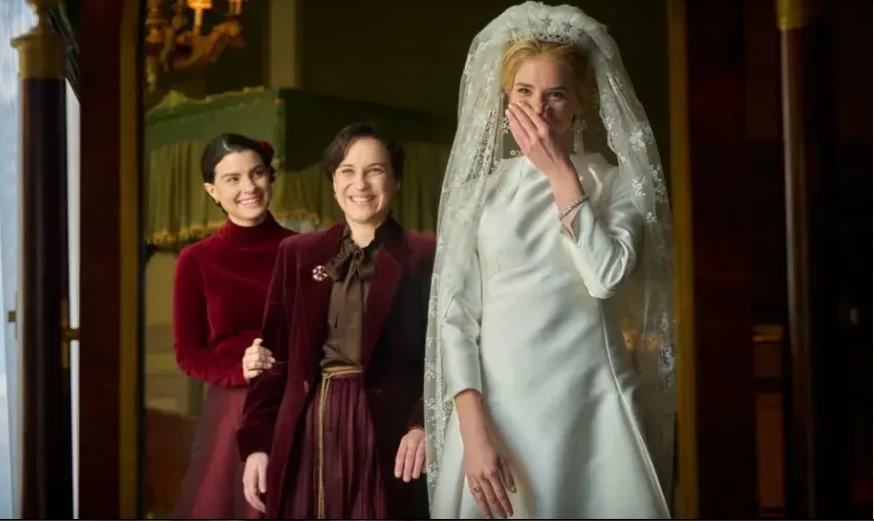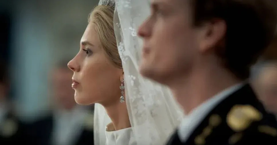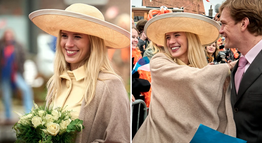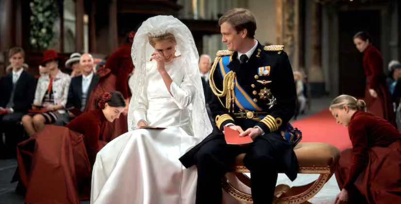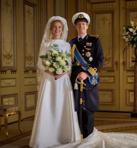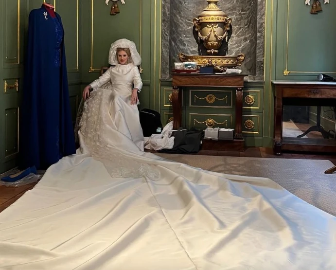 La versión de la ficción estuvo a cargo de la diseñadora de vestuario Margriet Procee, quien buscó una fidelidad casi estricta con el original. El resultado fue notablemente elogioso: misma silueta, cola imponente, velo trabajado, escote y estructura que remiten al Valentino sin ser idénticos.