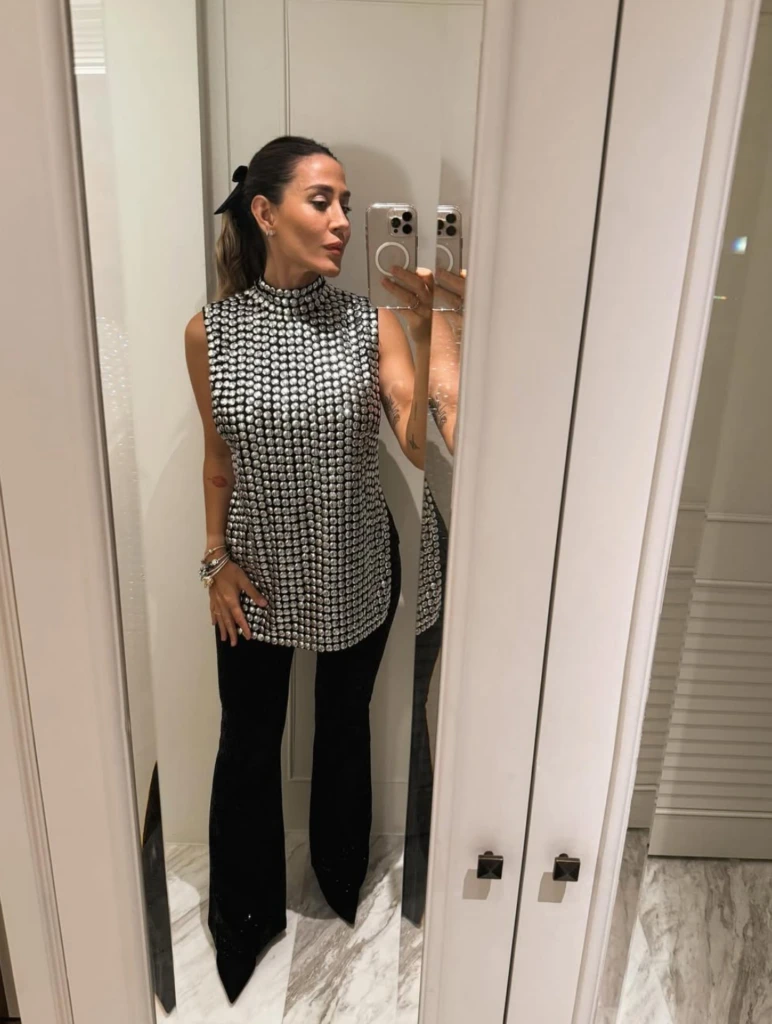 La cantante deslumbró con un conjunto de brillos total. La parte de arriba con un top cuello alto cubierto de con tachas bombe bordadas a mano, que combinó perfectamente con un pantalón bota ancha en negro con brillos.