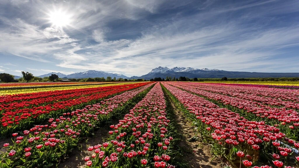 Uno de los fenómenos que vuelve famoso a este destino ocurre cada octubre, cuando el Campo de Tulipanes despliega un espectáculo natural incomparable. Filas de colores intensos —rojos, amarillos, violetas, naranjas— se abren paso al pie de las montañas y crean una de las imágenes más icónicas de la Patagonia. Este emprendimiento, ubicado a un desvío de la Ruta 259, recibe visitantes de todo el país que buscan vivir esta postal efímera que dura apenas algunas semanas.