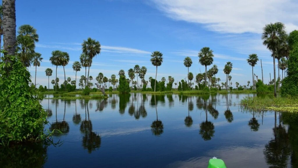 El escenario combina lagunas abiertas, palmares y los característicos “champales”: bosques anegados cubiertos por enredaderas que crean una postal selvática y singular. Cuando cae el sol, el cielo se refleja sobre el agua y transforma el entorno en un espectáculo ideal para la fotografía y la contemplación.