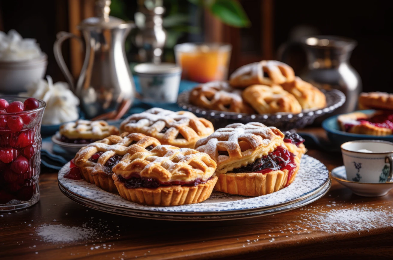 ¿Cuáles son las pequeñas delicias refinadas de la época Regencia? Las mini tortas o sponge-cake, los biscuits, los petit fours y las galletas finas de manteca. También eran populares algunos clásicos ingleses como los bath buns (bollos dulces con fruta, típicos de la alta sociedad de Bath), el banbury cake (pastelito de hojaldre con fruta) y la lardy cake (pan dulce especiado con fruta seca).