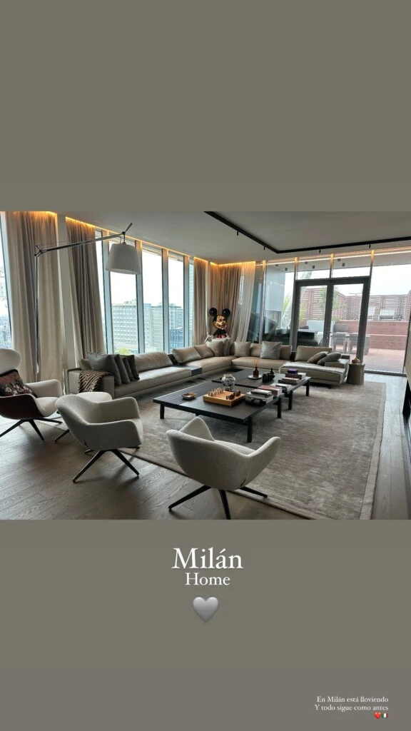 "En Milán está lloviendo y todo sigue como antes", escribió la conductora, cantante y empresara junto a un emoji de corazón rojo y una bandera italiana. En la fotografía se puede ver parte de su elegante living italiano con imponentes ventanales.