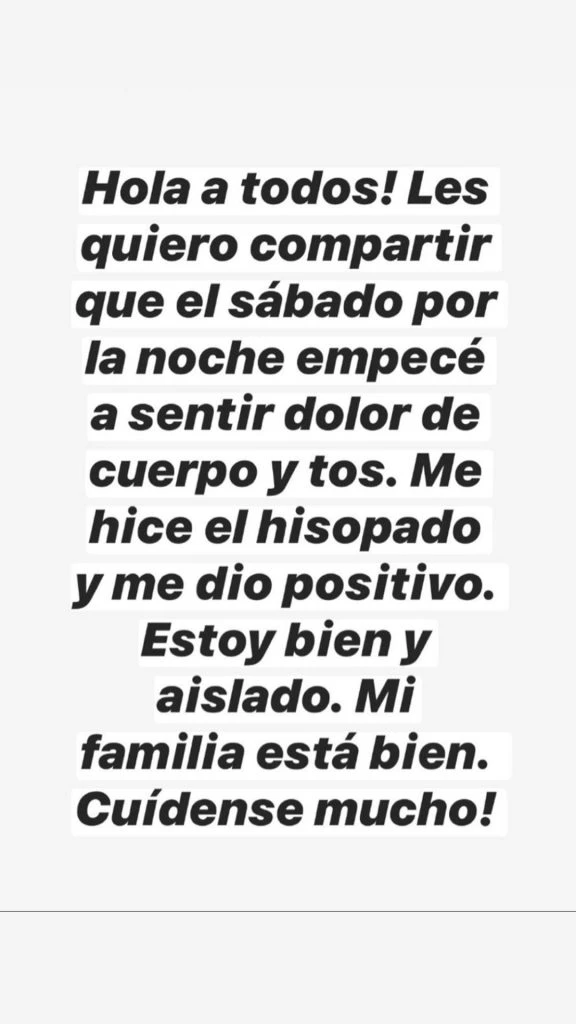 Manifestó sorpresa por haberse contagiado el virus, ya que considera haber tomado las medidas de precaución indicadas. Además, recordó que desde que volvió de un viaje a Europa, en los primeros días de marzo, evitó abrazar a sus compañeros y enseguida se autoimpuso en cuarentena, por miedo a contagiar el virus.