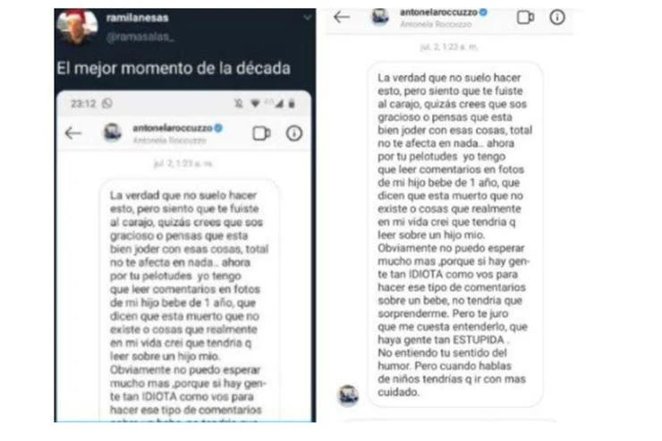 “La verdad que no suelo hacer esto, pero siento que te fuiste al carajo, quizás creés que sos gracioso o pensás que está bien joder con esas cosas, total no te afecta en nada...", comenzó el mensaje de la mujer de 31 años, nacida en Rosario, también madre de Thiago y Mateo.