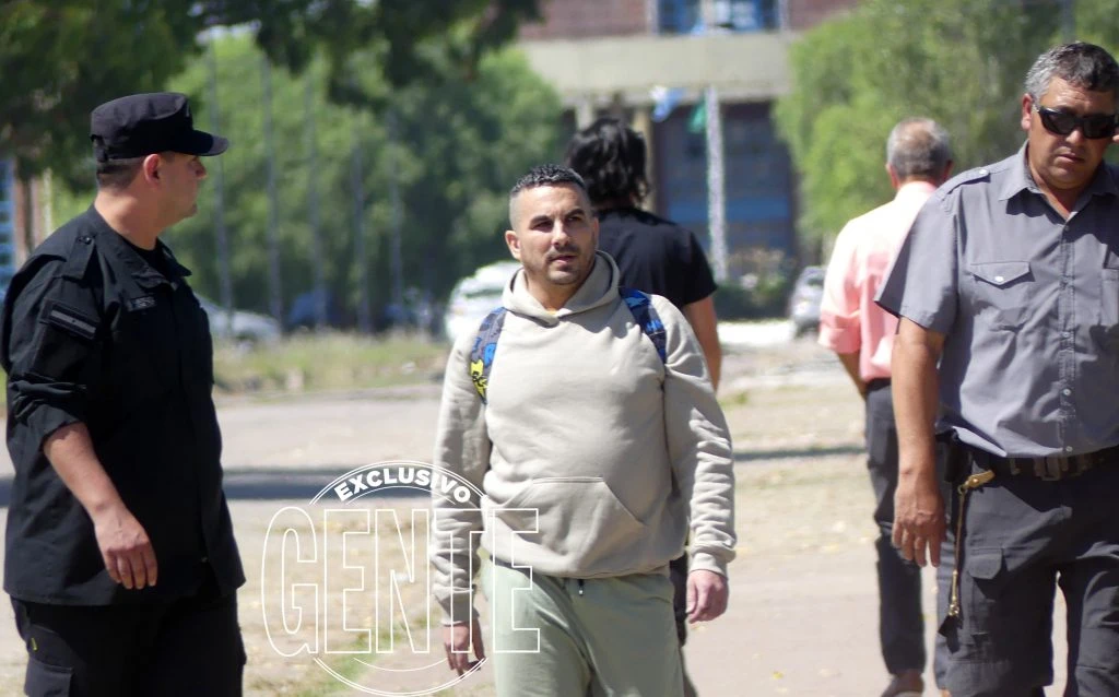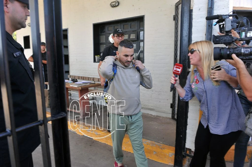 Acompañado de dos penitenciarios, Tablado camina con paso firme hacia la libertad con campera de buzo gris, jogging y alpargatas rojas.