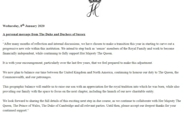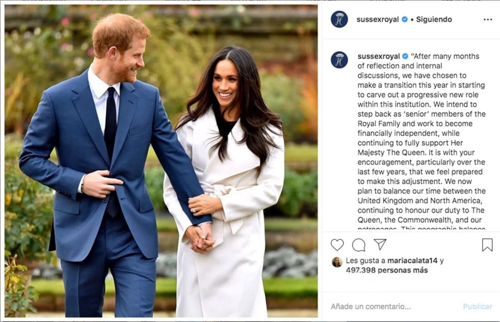 En un comunicado publicado en sus redes sociales ambos han informado de que han decidido "comenzar a forjar durante este año un nuevo rol" dentro de la monarquía, al tiempo que subrayan su "completo apoyo a Su Majestad la Reina", Isabel II.