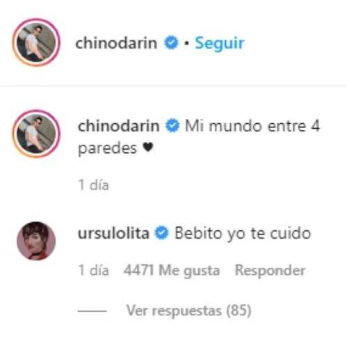 Primero fue el hijo de Ricardo Darín quien desde su cuenta de Instagram escribió "Mi mundo entre cuatro paredes", escribió el actor junto a una foto de Úrsula en un ascensor. "Tokio" de La Casa de Papel luce anteojos de sol, una riñonera cruzada y está arreglándose una cadenita del cuello.