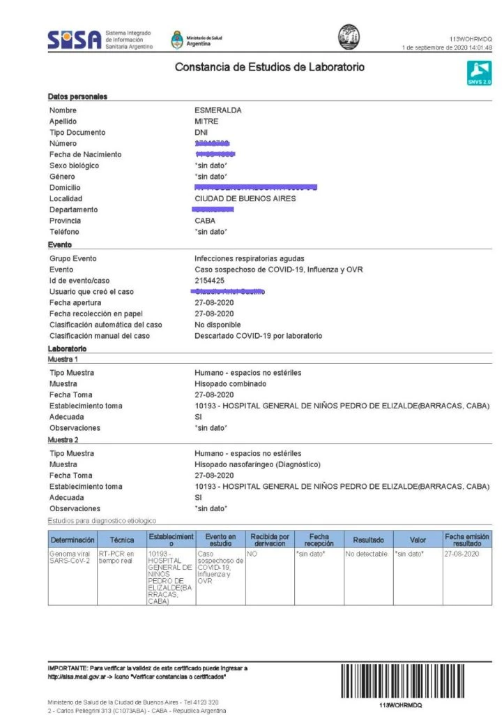El 27 de agosto, el informe de SISA daba Covid positivo tras el hisopado de la actriz. Y hoy –en sistemas del lugar– se cambió a negativo. El viernes se presentó en la pista de Cantando 2020 como "sospechosa".
