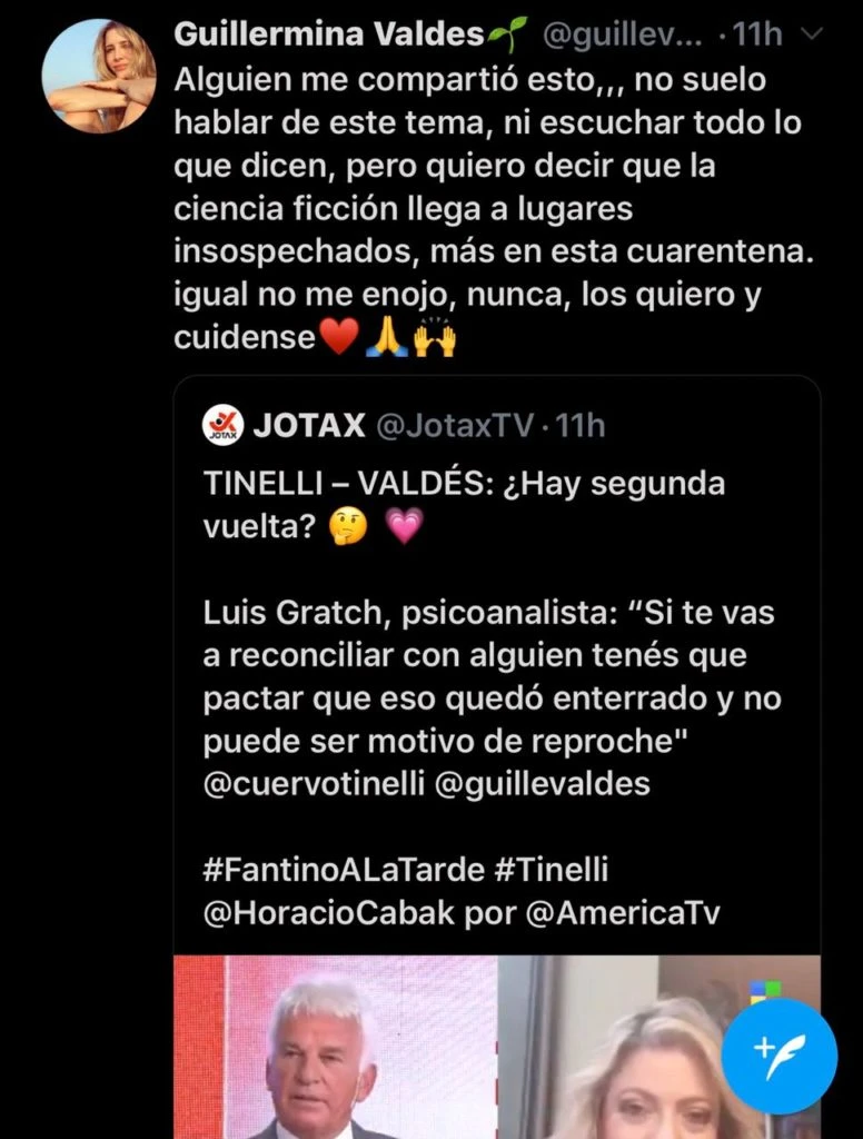 A raíz de un debate en Fantino a la tarde (América) en el que charlaban acerca de la posibilidad de una segunda vuelta de la pareja, Guillermina escribió: "Alguien me compartió esto. No suelo hablar de este tema, ni escuchar todo lo que dicen. Pero quiero decir que la ciencia ficción llega a lugares insospechados, más en esta cuarentena". Y cerró su tuit con un mensaje final: "Igual, no me enojo nunca, los quiero y cuídense".