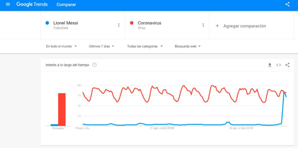 En buen romance, el nombre y apellido del argentino se disparó de tal modo que Google Trends, encargado de medir y cuantificar las consultas públicas de la compañía de Internet más consultada del mundo, el martes 25 de agosto subió a lo más alto de sus algoritmos a Lionel Messi, dejando en segundo lugar a la enfermedad del momento.