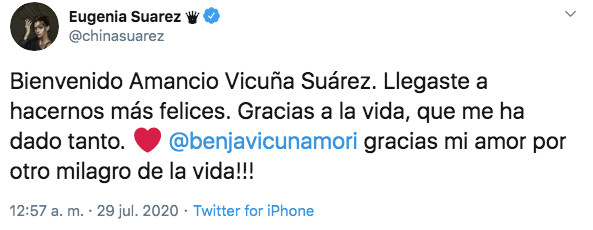 La China Suárez (28) y Benjamín Vicuña (41) fueron papás por segunda vez con la llegada de Amancio, quien llegó el 29 de julio, unas semanas antes de lo esperado por los también padres de Magnolia (2).