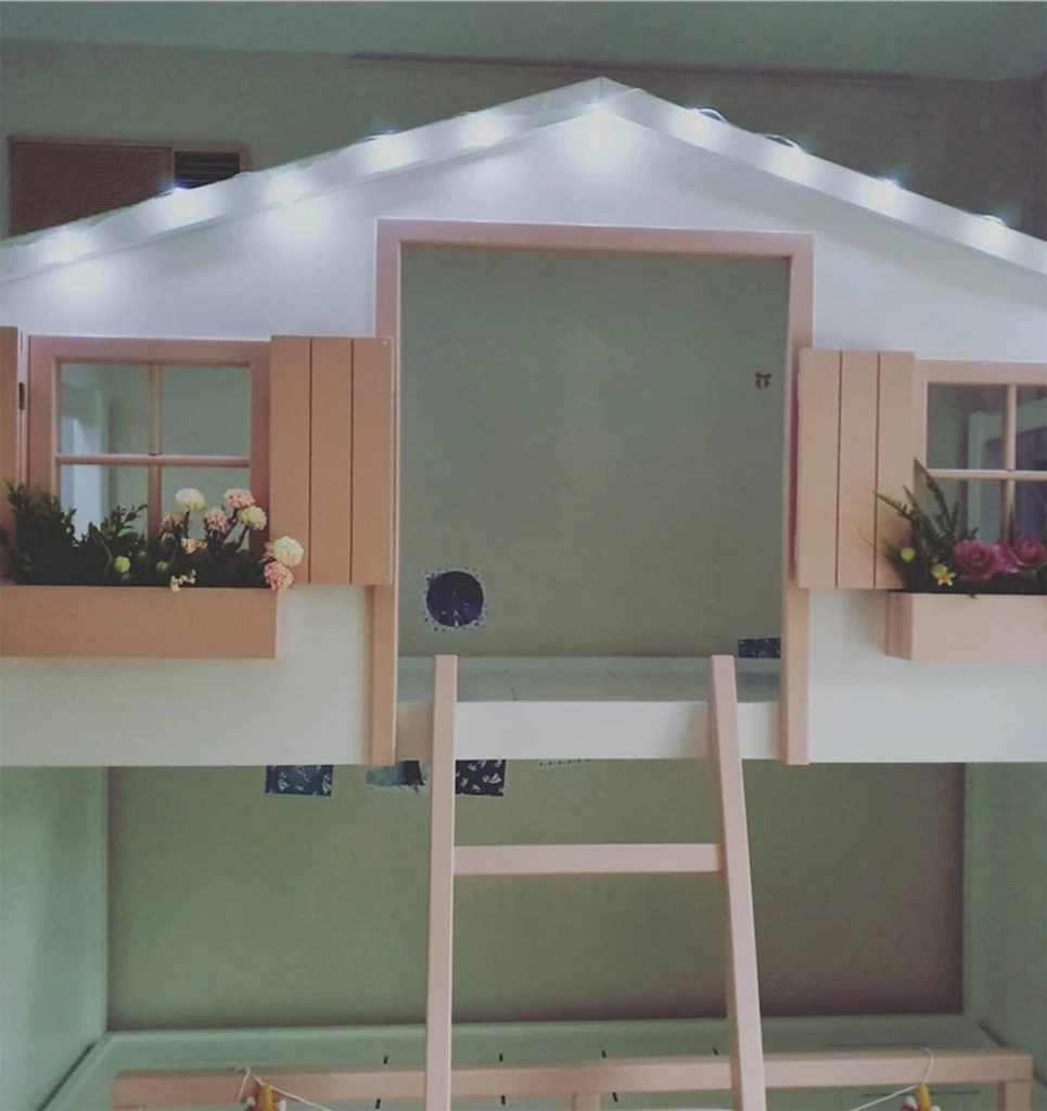 Se trata de una cama cucheta con forma de casita que tiene en la planta baja una cama y en la parte de arriba una sala de juegos súper divina.