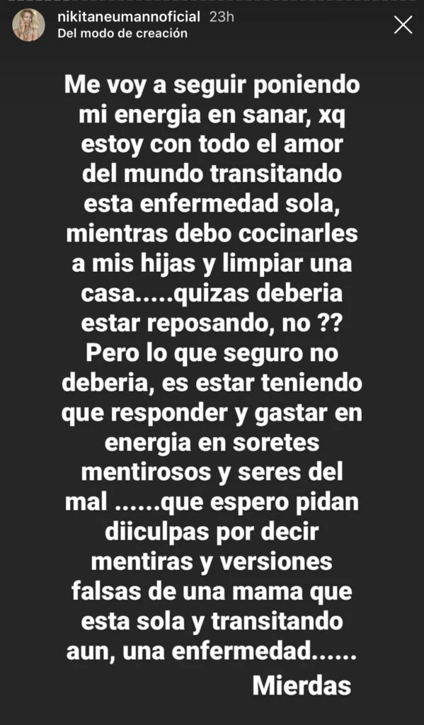 La modelo lanzó un fuerte descargo tras la filtración de un chat en el que la modelo menciona al ex futbolista y su pareja de revelar que Daniela, su empleada, se había infectado el Covid-19. "Ser noticia es lo único que les importa a los dos", agregó.