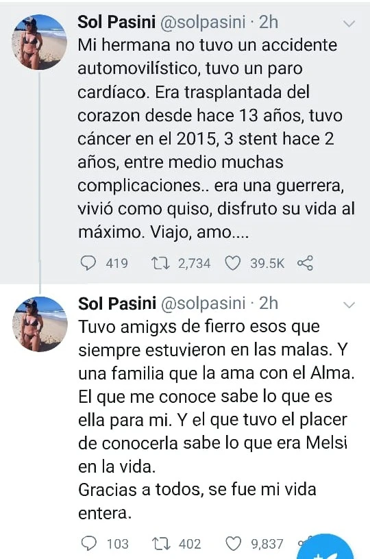 Solange Pasini, hermana de Melody, fue quien se encargó de explicar través de su cuenta de Twitter el motivo de la muerte: "Tuvo un paro cardíaco, una nueva consecuencia de los problemas coronarios que la chica sufría desde que era pequeña" .