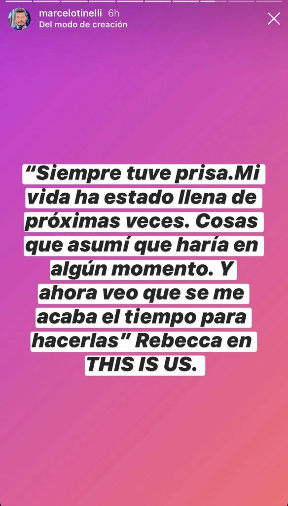 Y ayer por la noche eligió usar nuevamente su cuenta de Instagram para citar sus emociones y algunas frases inspiradoras, entre ellas: "Siempre tuve prisa. Mi vida ha estado llena de próximas veces. Cosas que asumí que haría en algún momento. Y ahora veo que se me acaba el tiempo para hacerlas". La misma pertenece a Rebecca Pearson, uno de los personajes protagónicos de This is Us, la serie estadounidense de cuatro temporadas con la que está fanatizado el conductor de ShowMatch.