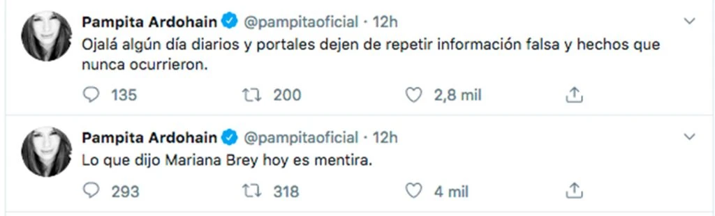 “Lo que dijo Mariana Brey hoy es mentira”, escribió Carolina en Twitter y agregó: “Ojalá algún día diarios y portales dejen de repetir información falsa y hechos que nunca ocurrieron”.