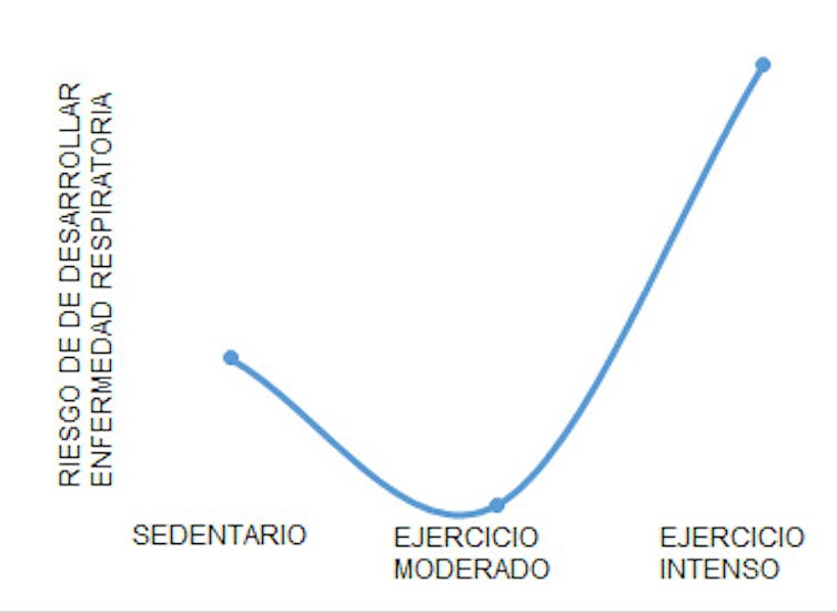 Si representamos en un eje horizontal la intensidad del ejercicio y en otro vertical el riesgo de padecer enfermedad de vías respiratorias, vemos que el ejercicio moderado hace decrecer el riesgo hasta un 50% (la curva baja, lo que implica que el sujeto está más protegido). Pero a medida que el ejercicio se hace más intenso, el riesgo de enfermar sube hasta 2-6 veces más que el del sujeto sedentario, situado en el extremo Jota.