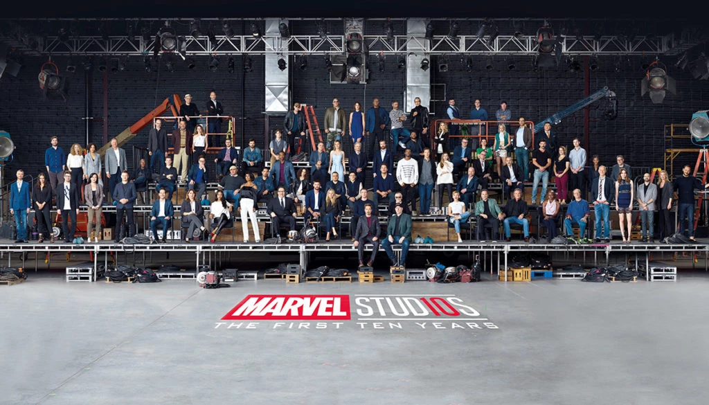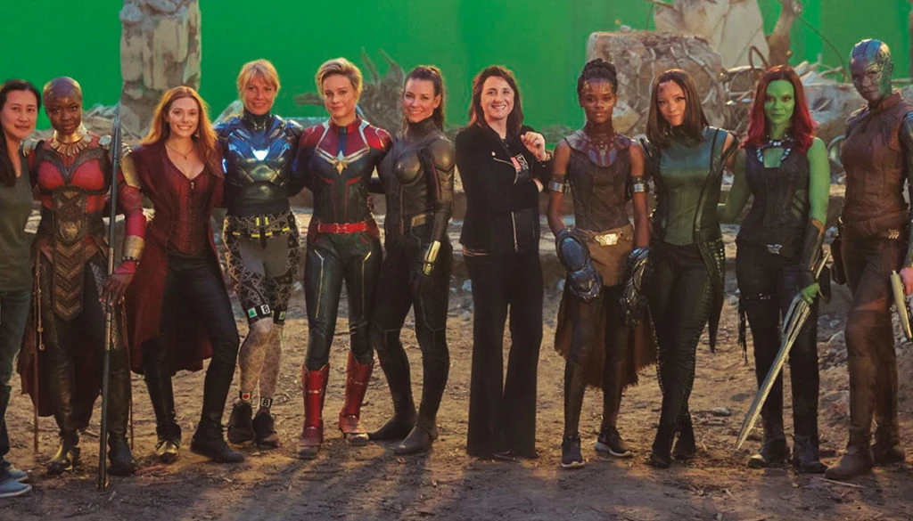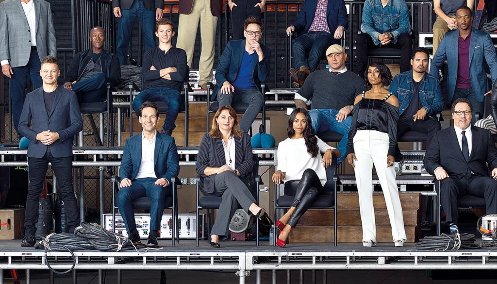 Rodeada por varones, entre ellos Kevin Feige (presidente de Marvel Studios –al centro, de remera negra–) y Louis D’Esposito (copresidente –de camisa azul–). Ella acaba de ser nombrada president of Production) de la compañía afincada en Burbank, ciudad del condado de Los Ángeles, estado estadounidense de California. Hasta hace pocos días ella era vicepresidenta ejecutiva de Producción.