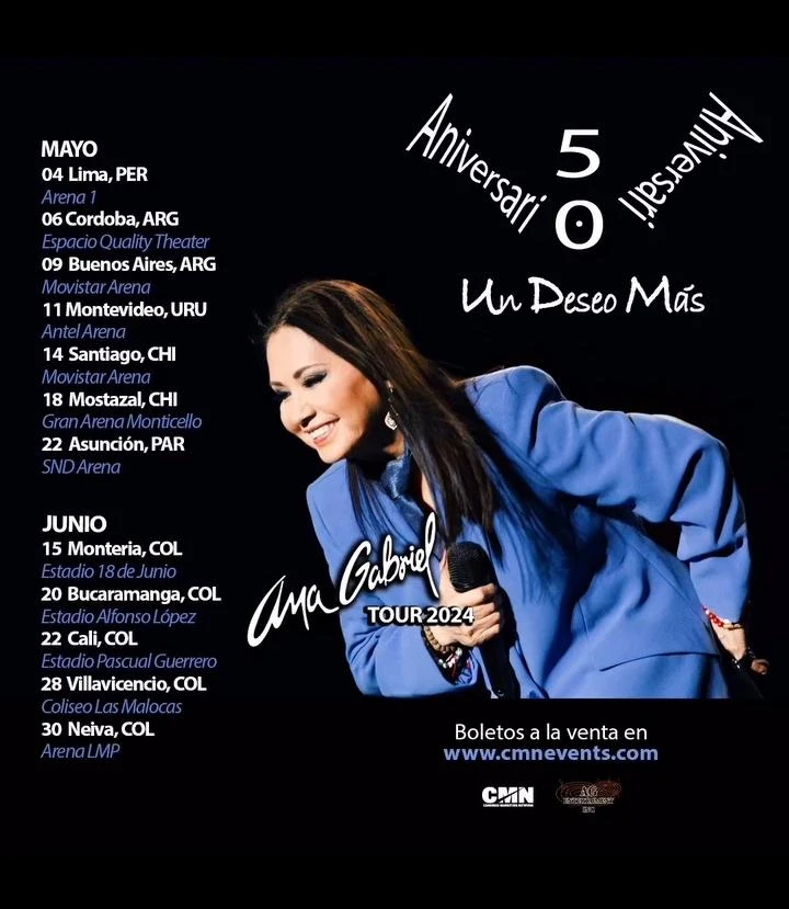 La cantautora y empresaria mexicana Ana Gabriel utilizó sus redes sociales para anunciar la segunda parte de su tour 'Un Deseo Más', que la llevará a visitar varios países de Latinoamérica en el segundo trimestre del año, como Colombia, Perú, Argentina, Chile, Uruguay y Paraguay.