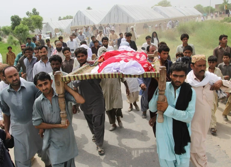Familiares y residentes de la modelo paquistaní Qandeel Baloch, asesinada por su hermano, cargan el cuerpo de la víctima durante su funeral en Shah Sadar Din, a 130 km de Multán, el 17 de julio de 2016 (AFP - SS MIRZA)