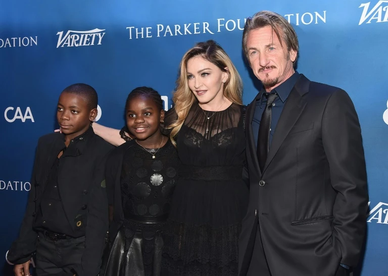De izquierda a derecha: David Banda, Mercy James, Madonna y Sean Penn durante una gala de ayuda a Haití, el 9 de enero de 2016, en Beverly Hills, Estados Unidos (GETTY/AFP/Archivos - Alberto E. Rodriguez)