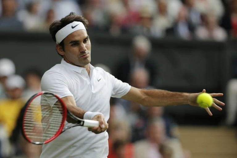El tenista suizo Roger Federer golpea una bola durante un partido de primera ronda de Wimbledon con el argentino Guido Pella el 27 de junio de 2016 en Londres (AFP - Adrian Dennis)