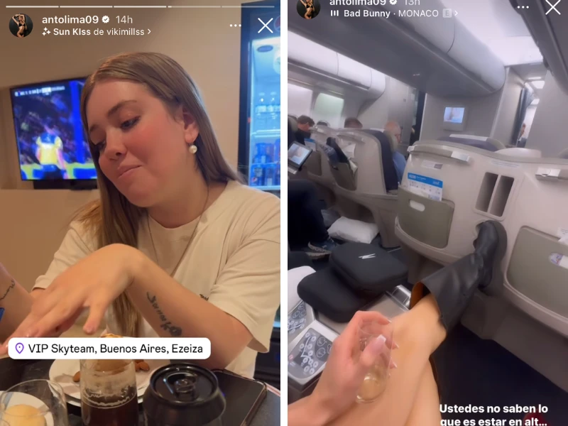 Una vez en Ezeiza, en el VIP de Skyteam, la reina de belleza uruguaya se mostró acompañada por una amiga antes de embarcar al avión y viajar en Priority Class.